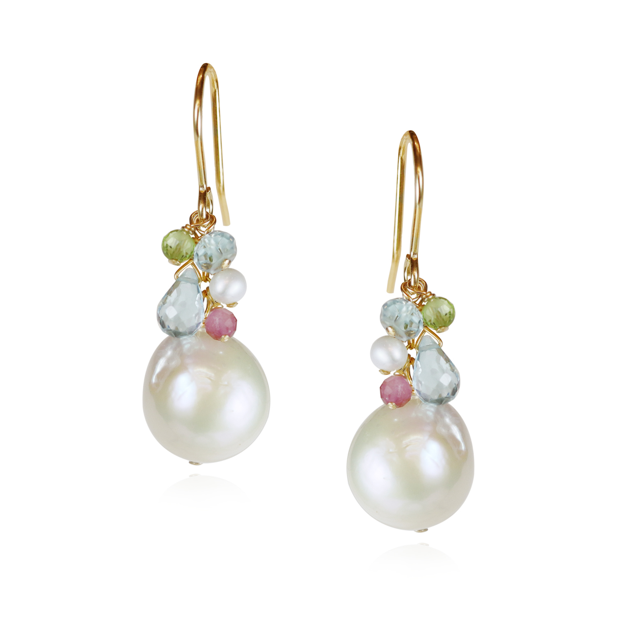 White baroque pearls with a cluster of blue topaz, peridot, pink tourmaline and white keshi pearls. All suspended from 14ct gold filled fish hook earrings. Approximate length of earrings is 2.5cms.