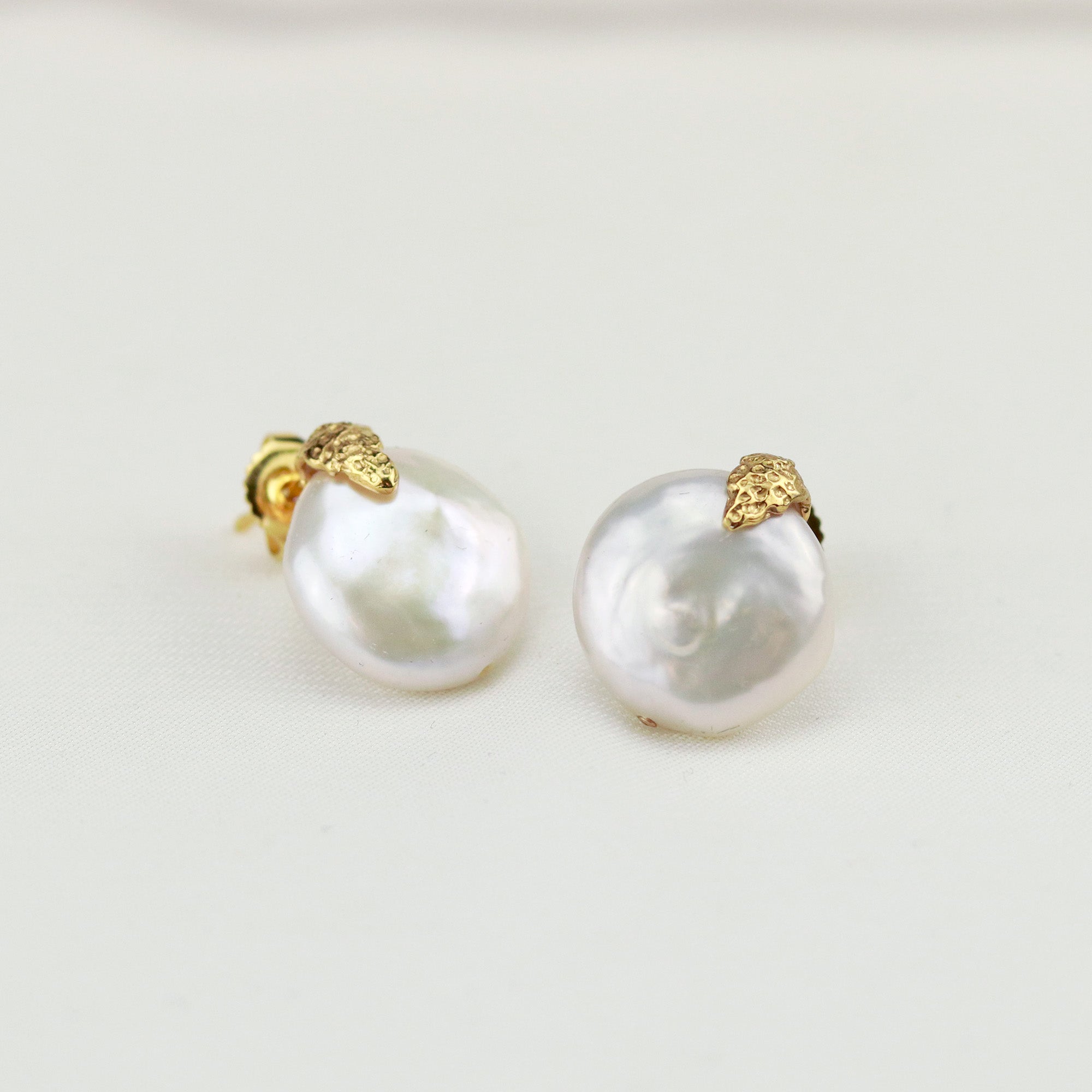 Stunning coin stud earrings featuring irregular round shaped keshi pearls on beautifully textured studs. Approximately 1.3 cm x 0.5 cm.