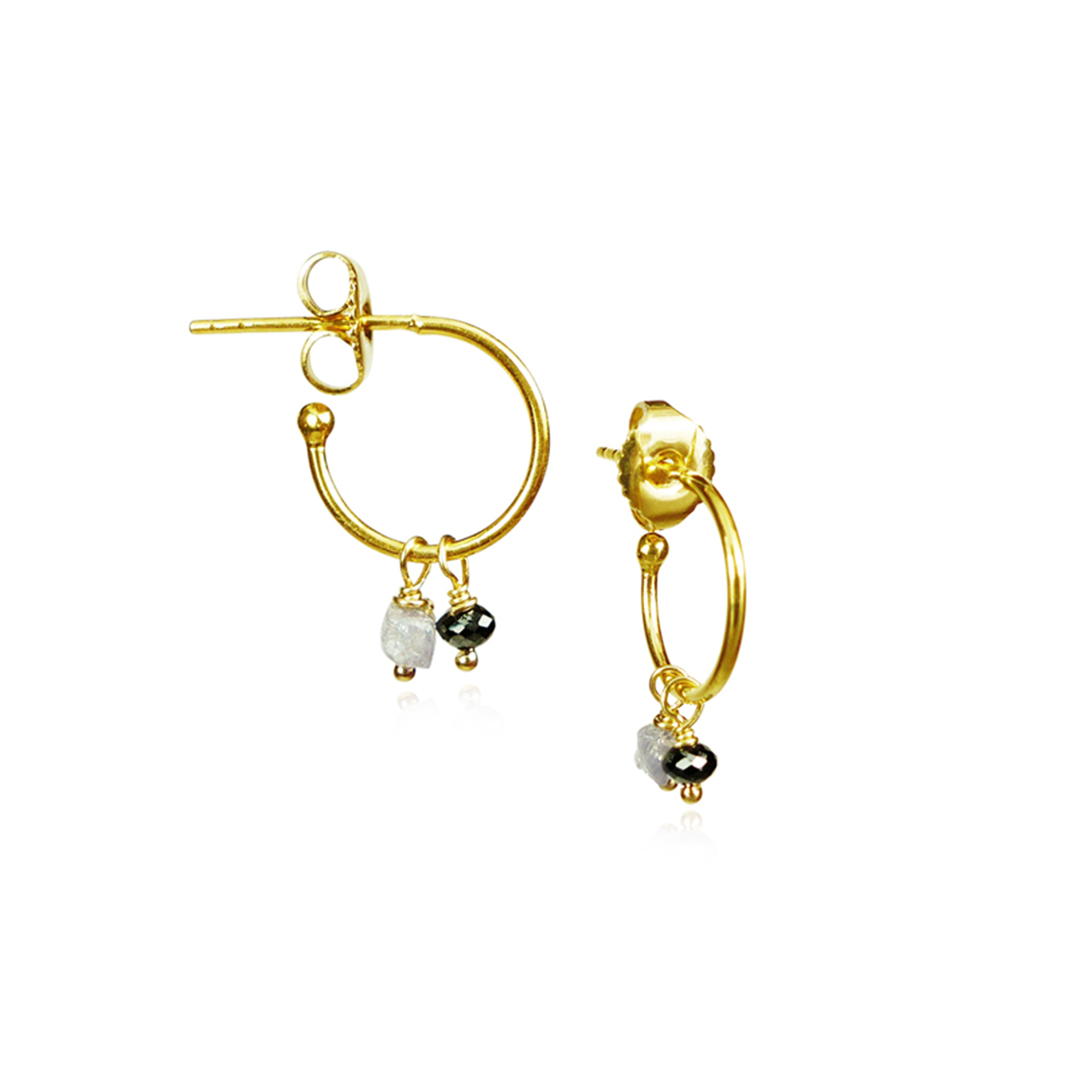 Dainty 18ct gold plated hoop earrings with rough diamonds. The grey diamond is a cube shape and the black one faceted. Easy and comfortable to wear they would make a great gift for yourself or someone special.
