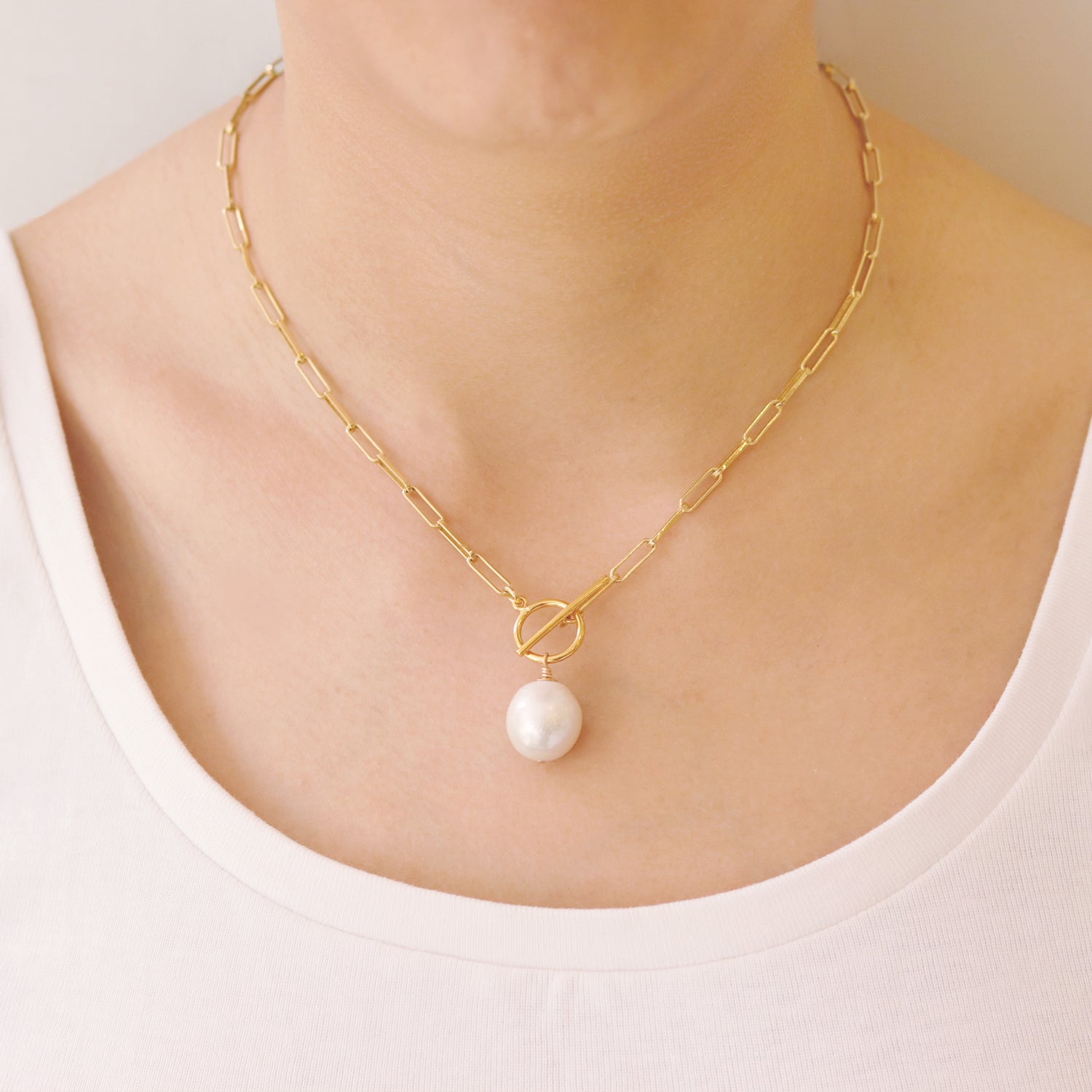 A paperclip chain necklace featuring a toggle clasp and a large baroque pearl. If you're looking something modern and with an edge, this is the one just for you! Approximately 20 in with 14 mm x 13 mm pearl.