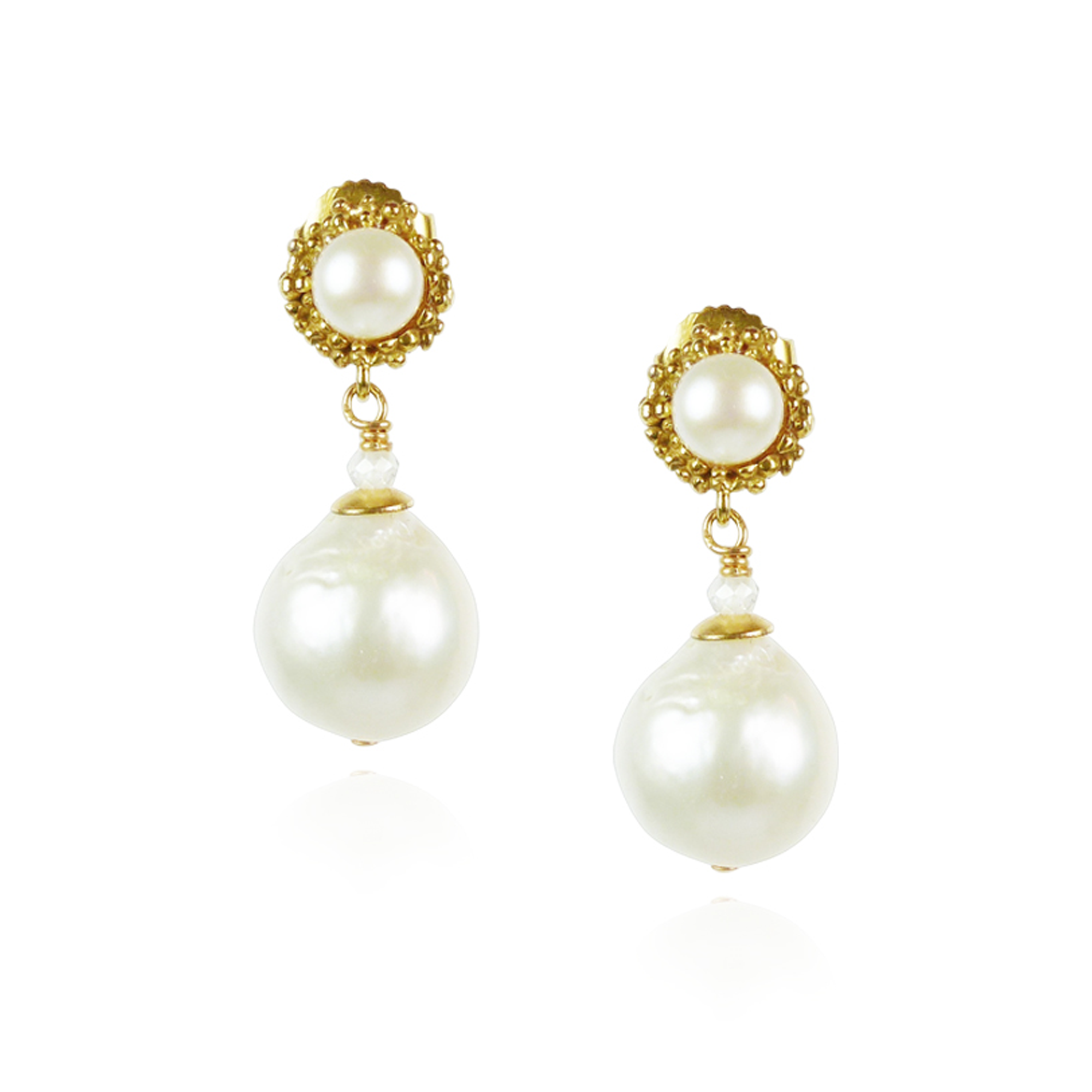 These gorgeous vintage inspired, 18 carat gold plated sterling silver drop earrings, feature white baroque natural pearls with moonstone beads suspended from a delicate textured setting with pearl cabochons. Another winning style from Mounir's bridal collection, these elegant earrings would look stunning on any bride!