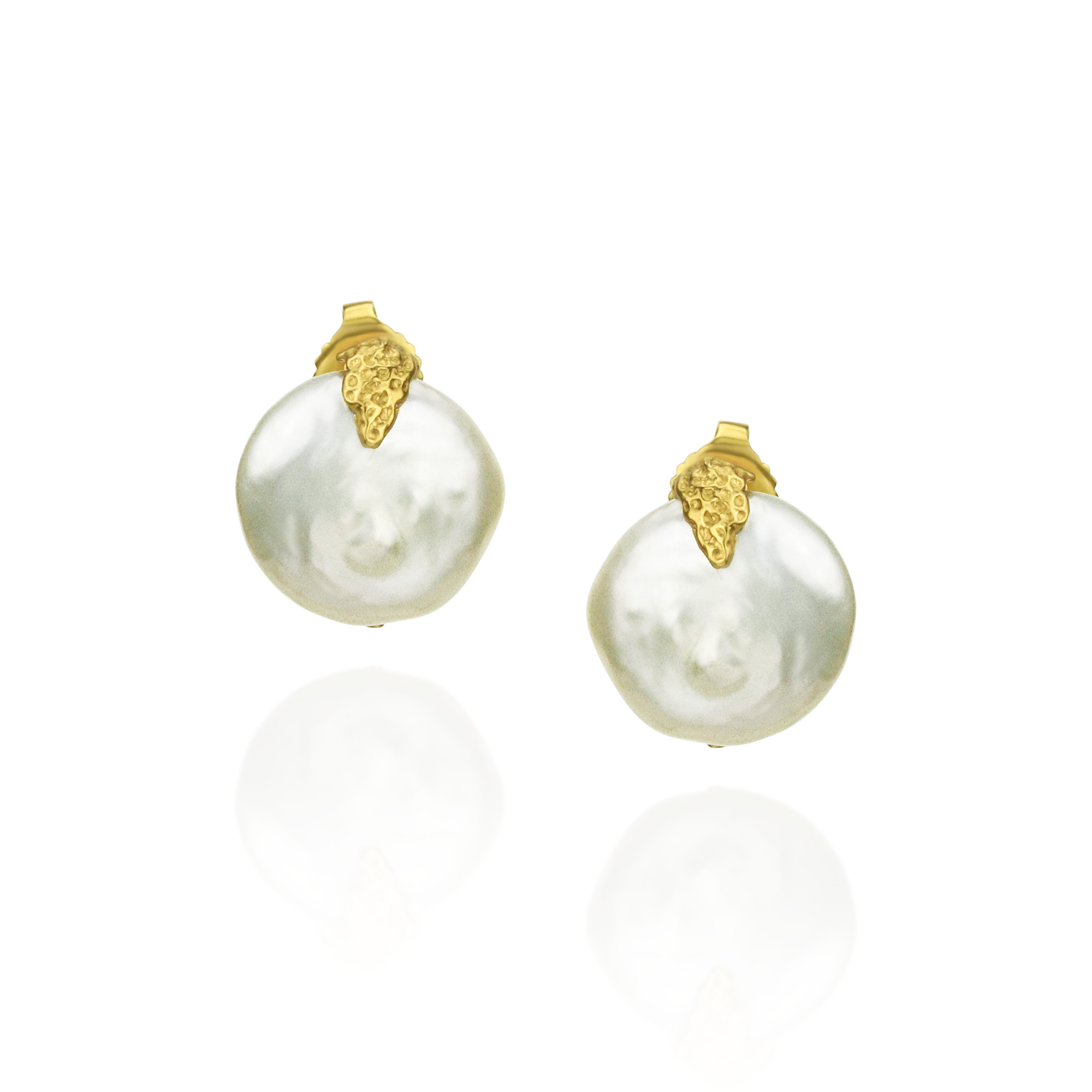 Stunning coin stud earrings featuring irregular round shaped keshi pearls on beautifully textured studs. Approximately 1.3 cm x 0.5 cm.