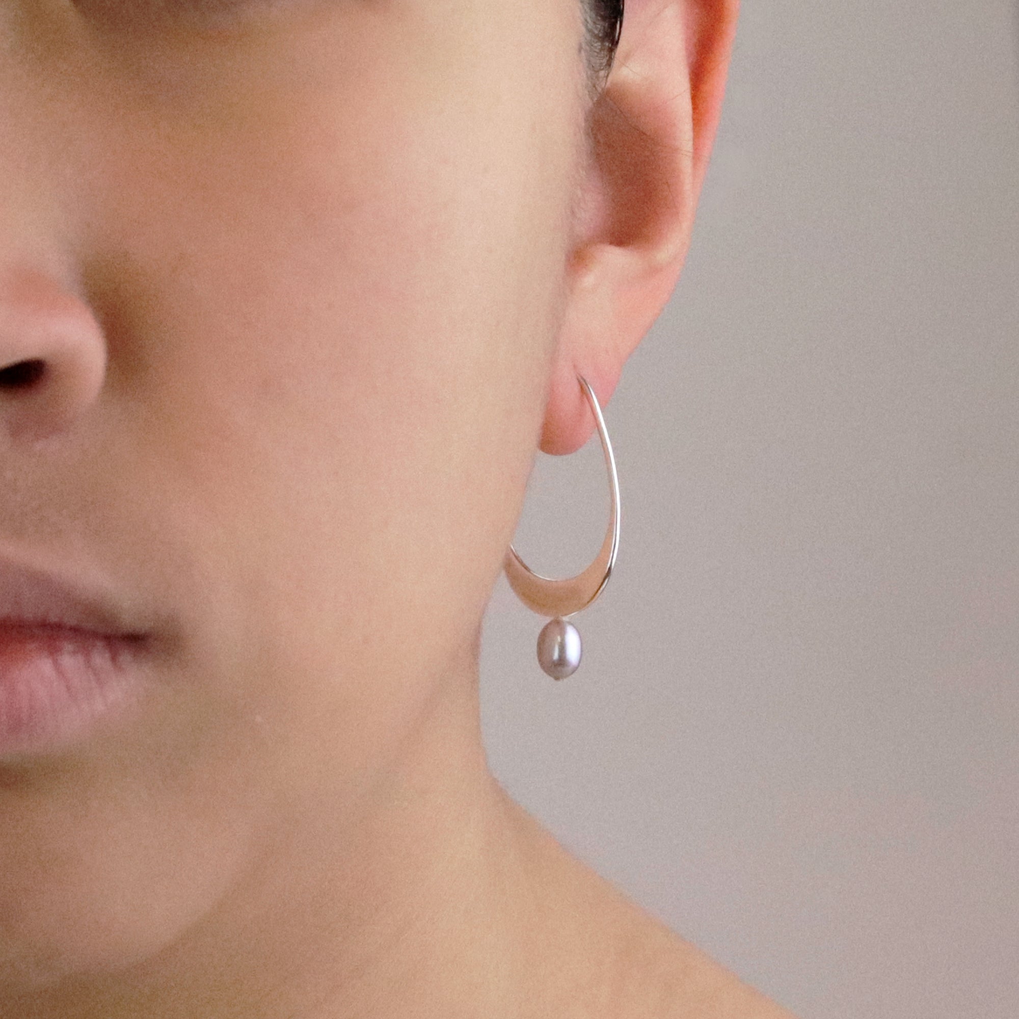 Elegant crescent-shaped hoops that marry contemporary design with timeless appeal. Choose between lustrous grey or white pearls, each suspended within a gracefully curved frame. Approximately 3.6 cm x 0.5 cm x 1.9 cm.